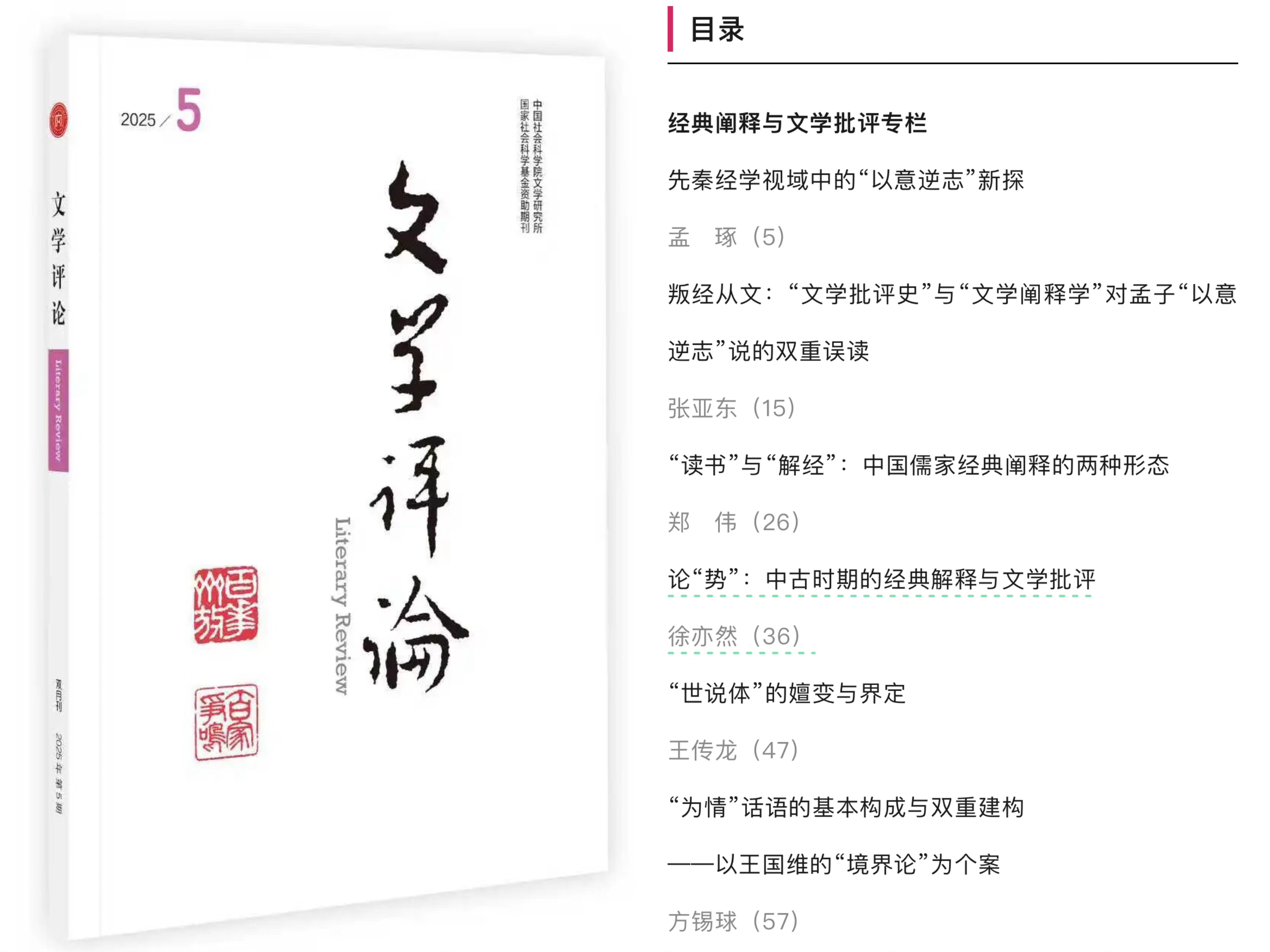 近日,beat365英国官方网站方锡球教授在文学类权威学术期刊《文学评论》2025年第5期发表学术论文《“为情”话语的基本构成与双重建构——以王国维的“境界论”为个案》。《文学评论》是中国社会科学院主管,中国社会科学院文学研究所主办的全国性文学研究和理论批评的大型学术刊物。
