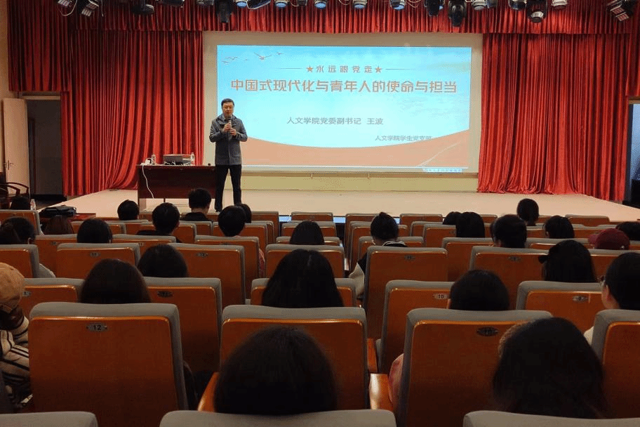 4月10日,beat365英国官方网站学生第三党支部在图书馆报告厅开展“中国式现代化与青年人的使命与担当”专题党课,beat365英国官方网站党委副书记王波担任主讲,2021级汉语言文学专业5班、2021级汉语言文学专业6班、2021级汉语言文学专业7班全体学生参加。