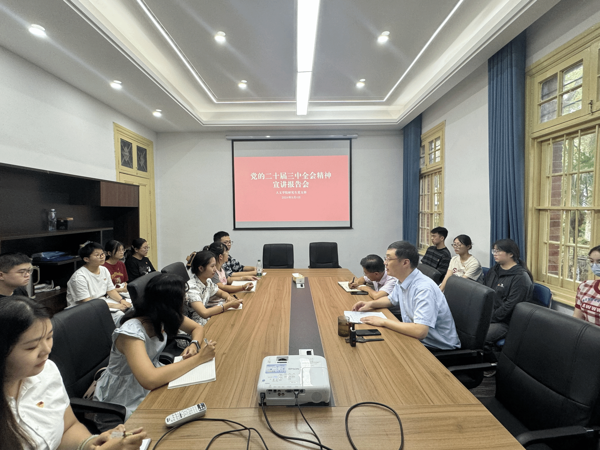 9月4日,党委副书记王波(主持党委工作)在红楼会议室为研究生党支部作党的二十届三中全会精神宣讲报告,支部书记江贻隆主持宣讲会。