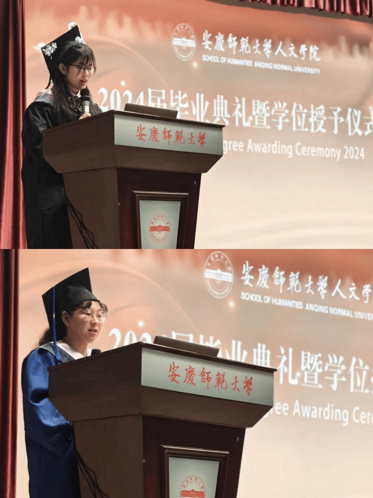 2024届硕士毕业生代表王小蝶、本科毕业生代表邱田田做毕业生发言。她们向悉心栽培学生的校领导、老师和辅导员表达了诚挚的感谢和祝愿,在回忆母校生活学习的点滴中感慨毕业的不舍,并希望学弟学妹们凭借雄心、恒心、决心和虚心等法宝,攻克难关,坚定理想信念,追逐心之所向,生动诠释了人文学子勇往无前的赤子之心。