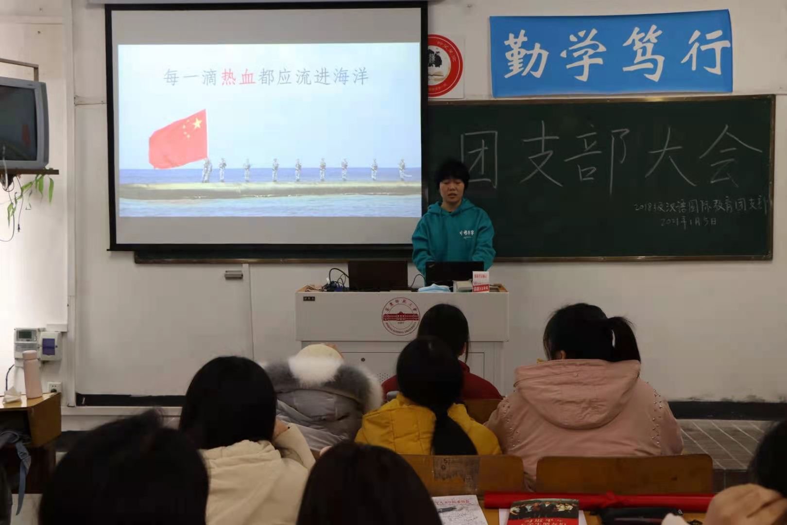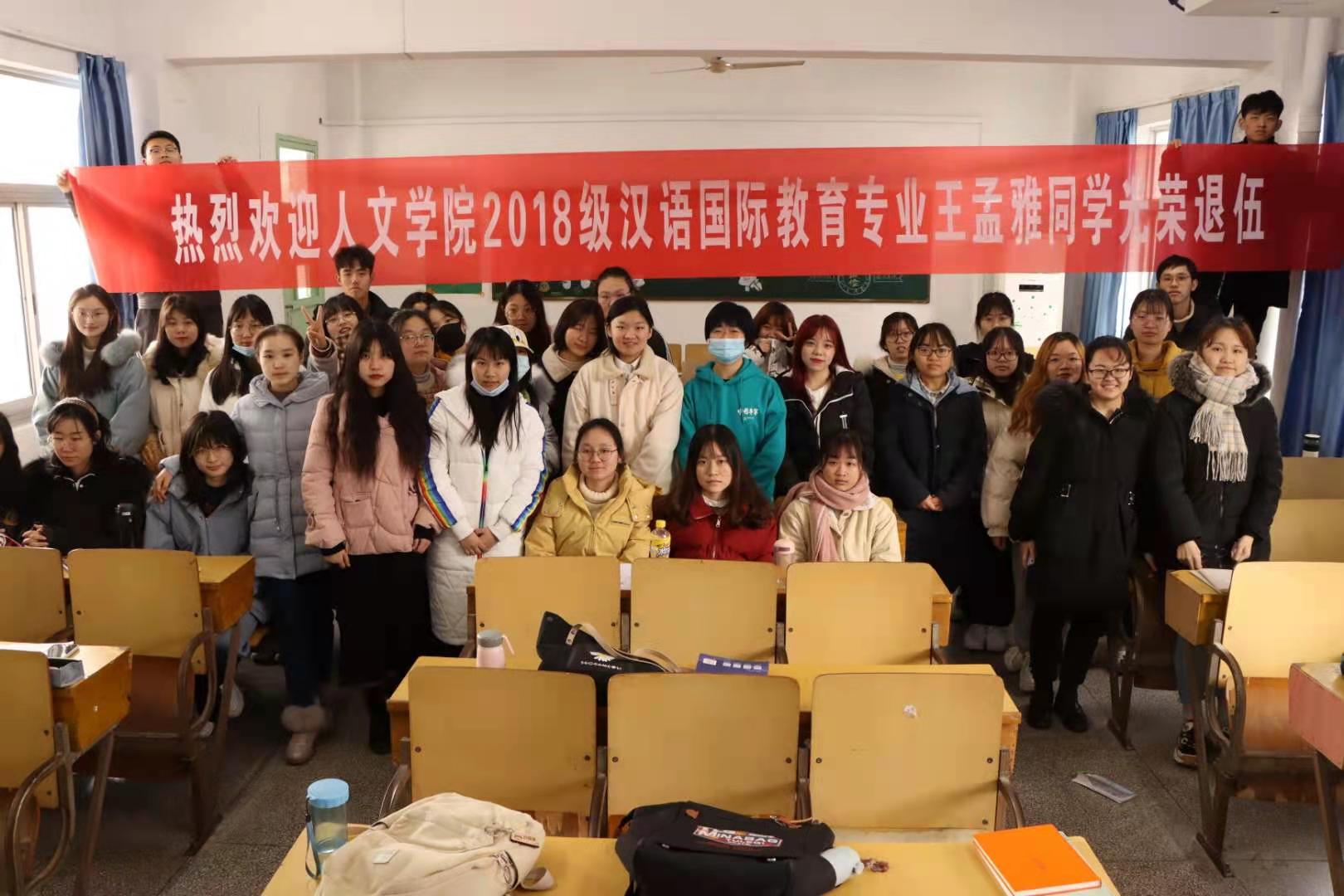 “热烈欢迎beat365英国官方网站2018级汉语国际教育专业王梦雅同学光荣退伍!”1月6日上午,在菱湖校区教学楼310教室,汉语国际教育专业2018级的学生们举办了一场特殊的欢迎会,欢迎刚从南海舰队退伍的王梦雅同学。