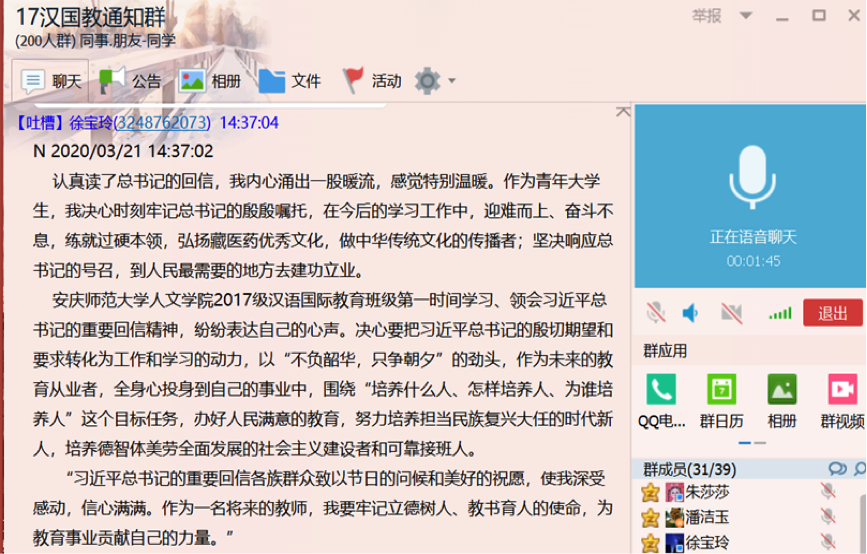 在学习分享活动中,许多同学分享了自己的看法和观点。2019级汉语言文学1班的宫金婷同学认为,新时代的广大青年应该立足基层,扎根人民群众,努力成为国家发展、社会进步、民族富强奠定强大的后备力量。2019级研究生赵莉同学说,作为大学生,我们应当发挥自己的专业特长和力量,积极帮助基层工作人员进行防疫防控工作,做好防疫工作宣传,承担起我们作为公民的责任。