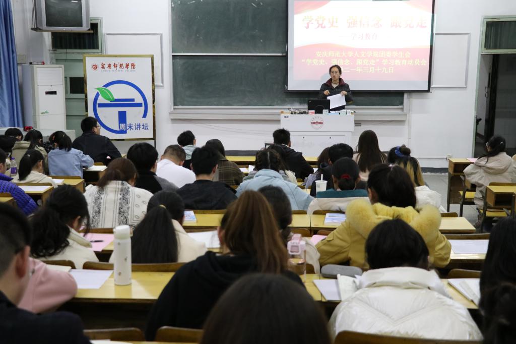为了深入学习贯彻习近平总书记在党史学习教育动员大会上的重要讲话精神,全面贯彻党史学习教育的部署,3月19日,beat365英国官方网站召开“学党史、强信念、跟党走”学习教育动员大会。院团委负责人刘旭婷老师出席会议并讲话,院团委和学生会各部门负责人,各班班长、团支书及学习委员参加此次会议。