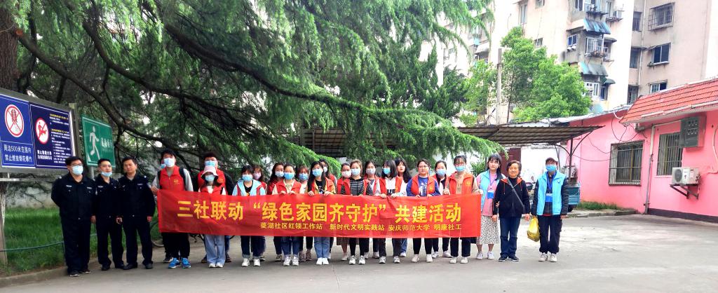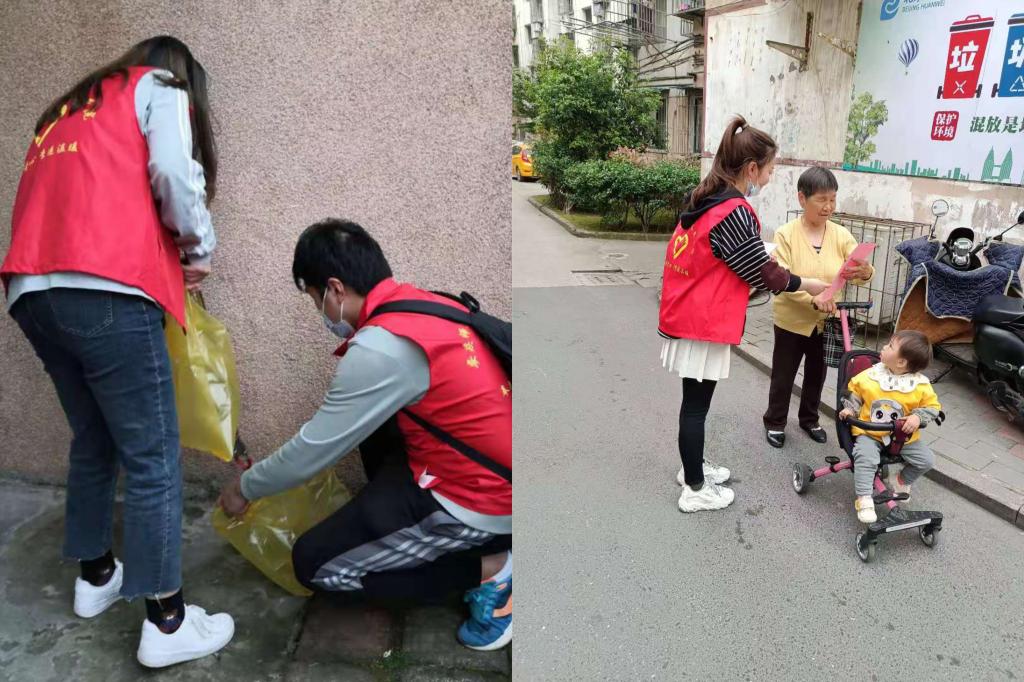 4月16日下午,beat365英国官方网站学生身穿红色志愿者马甲,在三社联动项目相关人员的带领下,走入菱湖社区参与“绿色家园齐守护”共建活动。