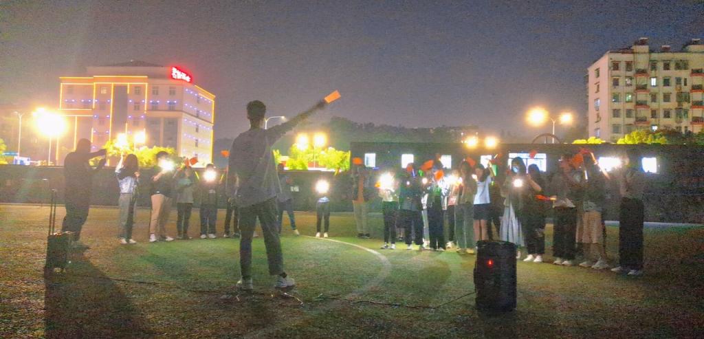 点歌、独唱、合唱……在场的40余名学生们手持小国旗、荧光棒围站成队列唱响了一首首经典红歌。整个环节共持续半个多小时,学生们在操场草坪上挥着荧光棒依次传唱《歌唱祖国》、《光荣啊!中国共青团》等红色歌曲。汉语言文学专业2019(6)班的曹鹏是这次活动的主要负责人,关于歌曲的选择,他介绍:“记录历史、歌唱祖国的经典红歌有很多,我们从中挑选出这些偏励志、动感的歌曲,更容易引起同学们的共鸣,彰显大学生的青春活力。”