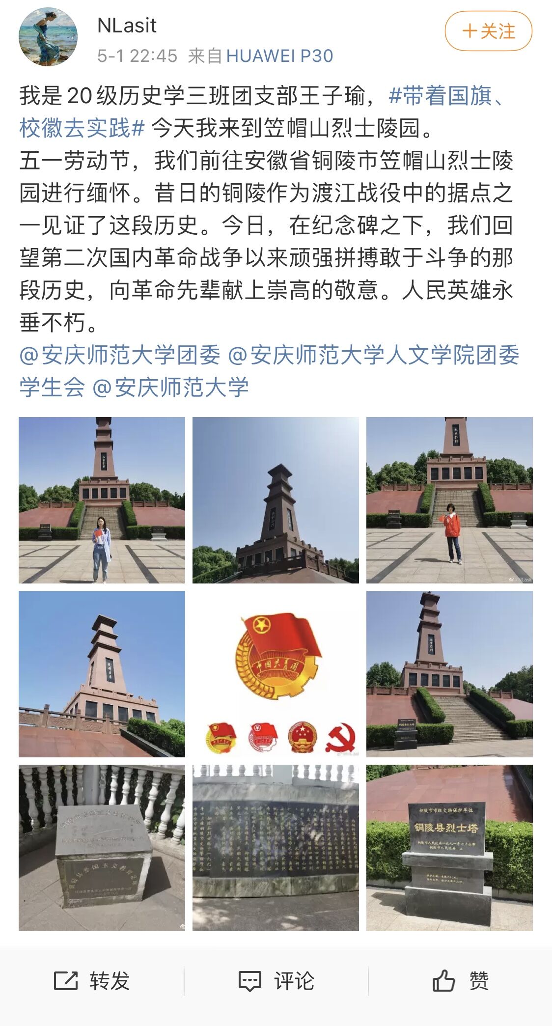 为深入开展党史学习教育,帮助青年学生增强爱党敬党意识,提升政治素养、网络素养,传播网络正能量,5月1日至5日,学院结合校团委精神的要求,开展“带着国旗、校徽去实践”图文征集活动。beat365官网学生积极报名,踊跃参与。2019、2020级邱美玲、蔡洁、李士龙等同学自行选择黄镇生平事迹陈列馆、合肥渡江战役纪念馆等红色教育基地,佩戴校徽、团徽、学生证与国旗、团旗进行合影并写下文字感言,进行图文编辑后在新浪微博发表。
