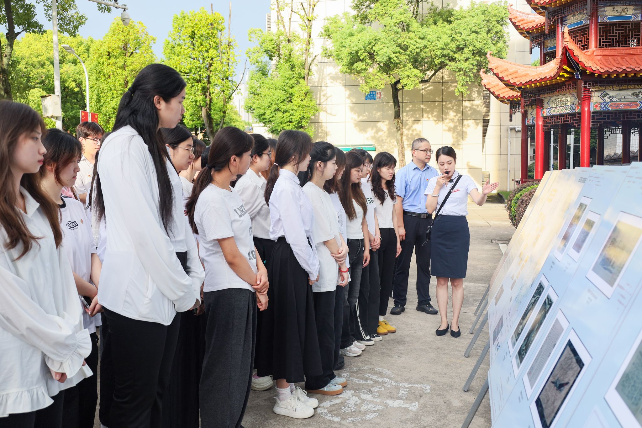 教学楼前,由中共安徽省委宣传部、安徽省文旅厅共同指导,安徽博物院、安庆市独秀园管理处共同主办的“烽火画卷——宣传画中的安徽抗战记忆”展在学校集中展出。安庆市独秀园管理处讲解员杨丽轻指展板图画,向学子们讲述安徽抗战史:“《流浪三年》里百姓颠沛的身影,《坚持敌后抗战收复失地》中战士冲锋的姿态,都是历史的真实印记。”从战争初期的黑白灰,到抗争场景的彩色刻画,再到战争胜利的红色基调,版画艺术让书本上的历史变得可触可感。”还有抗战时间脉络,安徽抗战的历史画面一下子清晰了。”汉语国际教育专业2024(1)班杨晨说。