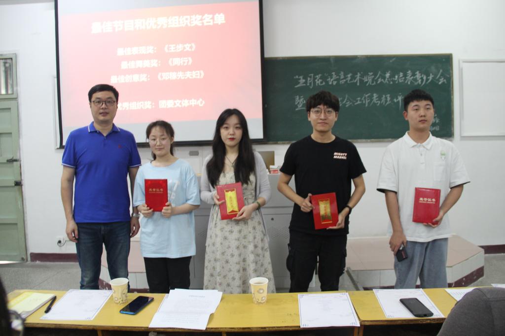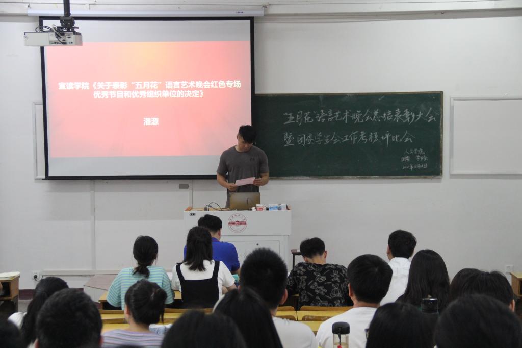 会上,相关辅导员宣读了《关于表彰“五月花”语言艺术晚会红色专场优秀节目和优秀组织单位的决定》文件。《王步文》节目组代表李子健、《同行》节目组代表吴婷分别上台发言。
