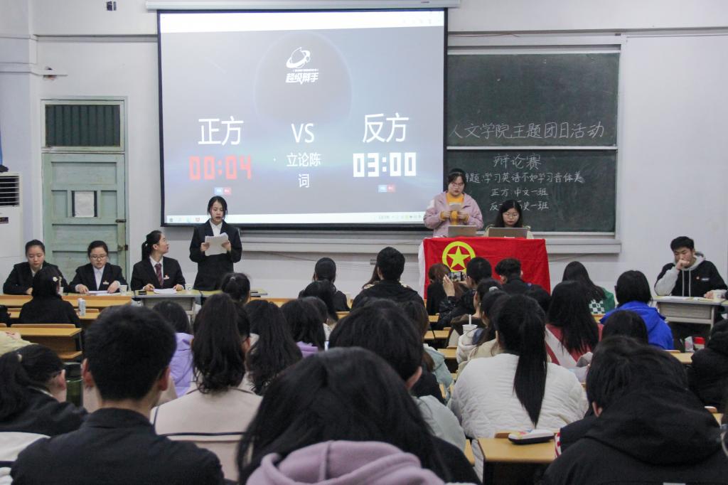 “我方认为英语和音体美不是非此即彼的取舍问题,而是如何相互补充、齐头并进的问题。”在“学习英语不如学习音体美”的辩论中,正方中国语言文学类专业2021(1)班代表队首先从英语能够被人工智能代替、音体美发展前景更加光明、英语学习成本比音体美高,这三个观点展开论述,强调在目前环境背景下,英语学习的重要性应当有所下调,音体美的地位应当得到相应的提升。而反方历史学专业2021(1)班代表队则从英语相对于音体美来说在应试中更为重要和经济全球化下国家对英语人才的需求越来越多这两个观点进行驳辩。赛场上,辩手们紧扣主题,理清脉络,针锋相对,赢得观众阵阵掌声。