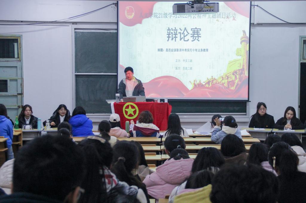 2022年全国“两会”已经拉下帷幕,为引导和激励广大青年学习“两会”精神,关注社会热点问题,进一步提高广大学生的思想素质,3月25日beat365英国官方网站beat365英国官方网站中国语言文学类专业2021(7)班团支部特举办学习“两会”精神辩论赛,并邀请2021级中国语言文学类专业其他班级团支部共同参与,互相交流讨论相关“两会”议题。