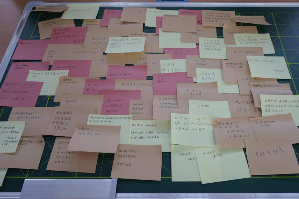 活动分为知识问答、便签寄情两个环节,参与者在第一关回答完有关党史、团史和中秋节文化知识的问题后,便可获得一张明信片作为“入场券”。“欲醉欲眠欲寻月,且与今夕共团圆。”接下来的一关里,学生们要在便签上写下对家人和老师思念和祝福,并将其贴在专门的展板上。而在最后一关,参与者可从五仁馅、椒盐馅、黑芝麻馅等众多月饼中挑选一个符合自己口味的带走。