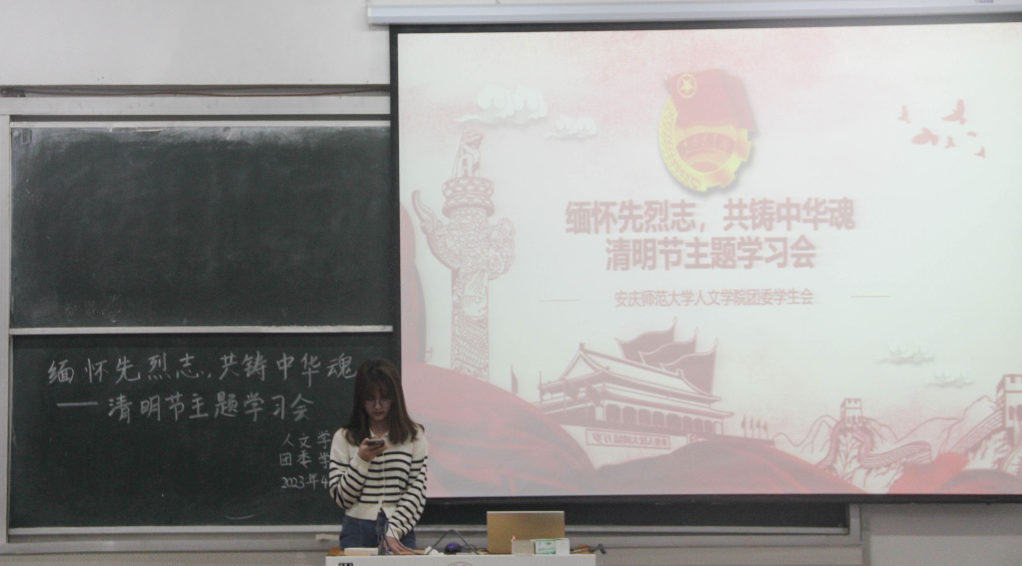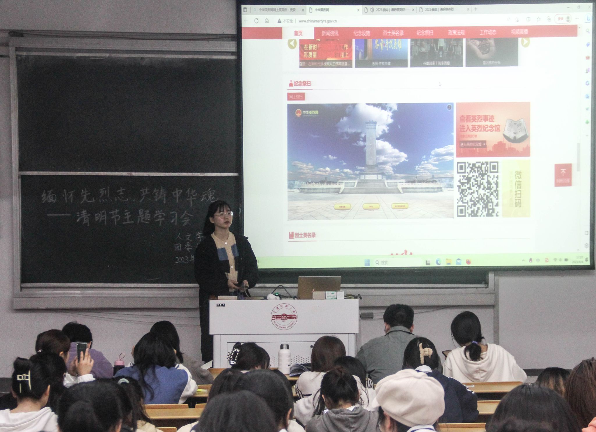 4月4日下午,团委学生会举办了“清明节缅怀先烈”主题学习会,各个部门代表依次上台向同学们讲述一位先烈的故事。有宁死不屈的抗战女英雄朱凡;有“只有站着死,绝不跪下”的革命者陈延年;有大义凛然的革命家方志敏;有早期无产阶级革命家赵世炎……其中,团委办公室部长为我们讲述了青年戍边战士陈榕祥烈士的感人事迹。陈榕祥同志积极参与祖国边防建设,遵守部队纪律,响应党的号召。在一次边防一线的任务中,他为救战友而壮烈牺牲。雪山回荡英雄气,青山有幸埋忠骨。“清澈的爱,只为中国”是铿锵的口号,亦是他一生的写照。通过开展故事会,青年学生对先烈们的英雄事迹有了更深刻地理解,爱国情感更加强烈。