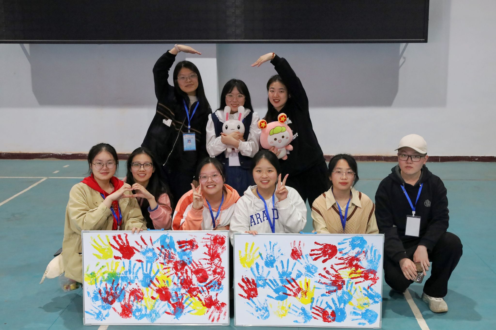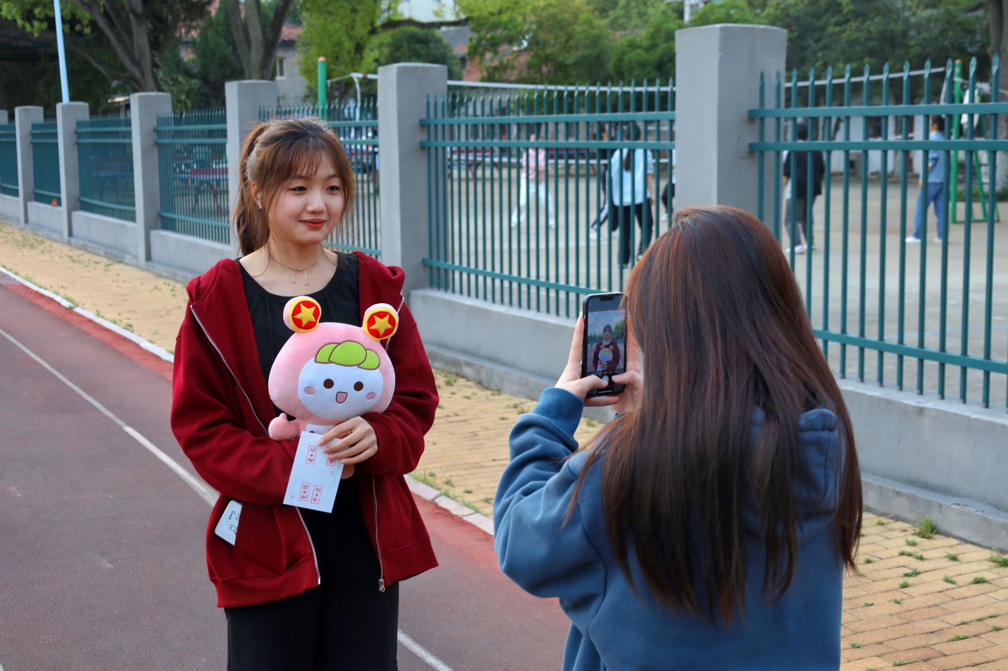 在操场的另一端,两只共青团吉祥物“惊艳亮相”,吸引学生们纷纷前来打卡围观。中国语言文学类2022级5班的李艳萍抱着吉祥物“团团”与“团兔”,摆出不同自拍造型合影留念。“吉祥物寓意着我们青年人团结一心、不懈奋斗的精神品质,不仅展现出我们对未来的憧憬,更启发我们要不断继承与发扬‘五四’精神。”