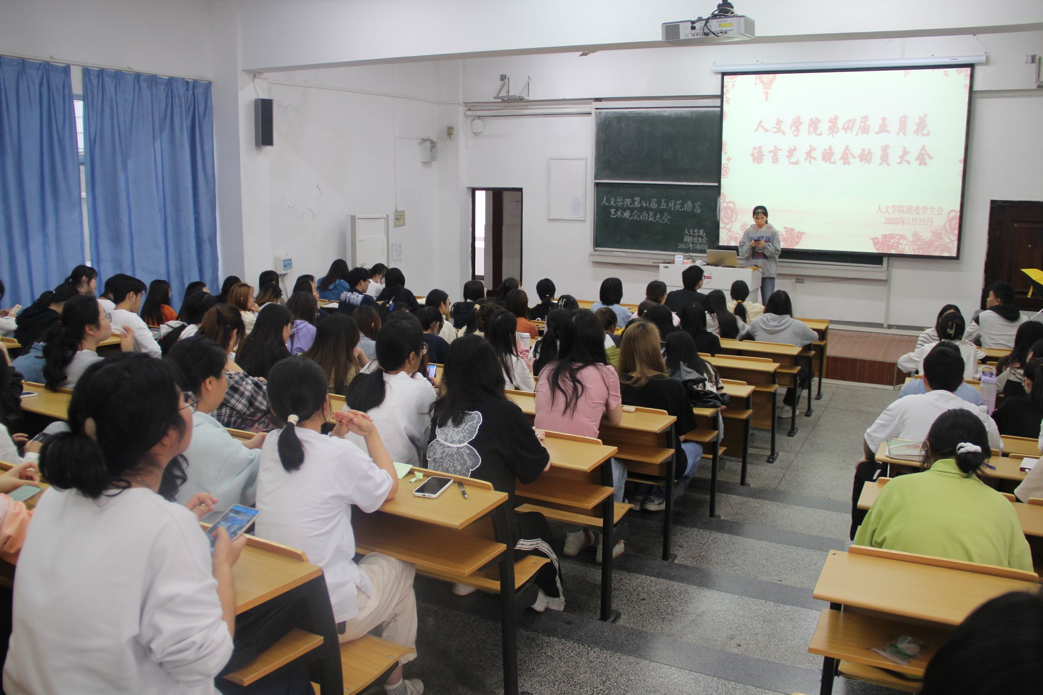 5月24日下午beat365英国官方网站召开第41届五月花语言艺术晚会动员大会,beat365英国官方网站团委洪星星老师出席指导。自晚会筹备以来,学院高度重视,团委学生会各部门成员各司其职、相互配合,如今晚会筹备已进入最后倒计时阶段。