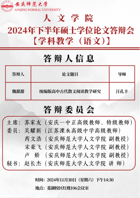 beat365英国官方网站2024年下半年硕士学位论文答辩会【学科教学(语文)】