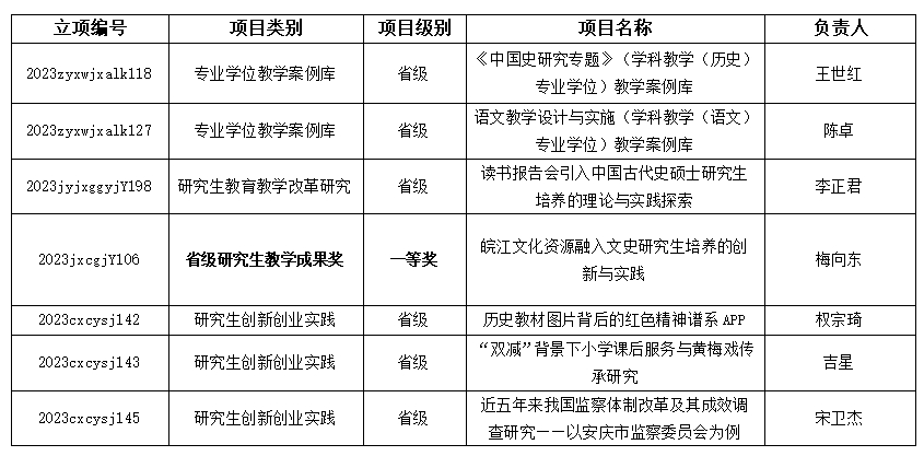 日前,安徽省教育厅公布了2023年度新时代育人质量工程项目(研究生教育)立项名单,beat365英国官方网站师生再创佳绩,共有4个类别7个项目获批立项,充分展示了学院在研究生教育领域的良好基础和深厚实力。具体情况如下: