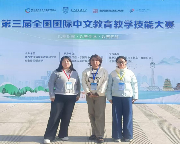2025年11月21日至23日,由陕西省汉语国际教育研究会、西安外国语大学主办的第三届全国国际中文教育教学技能大赛在陕西西安顺利举办。由张瑾老师带队,beat365英国官方网站国际中文教育专业2025级硕士研究生夏翠云和汉语国际教育2023级本科生王永鑫参加参加了本次大赛。经过激烈角逐,夏翠云和王永鑫两位同学荣获优秀奖,张彤彤、张莹两位老师荣获“优秀指导教师奖”。