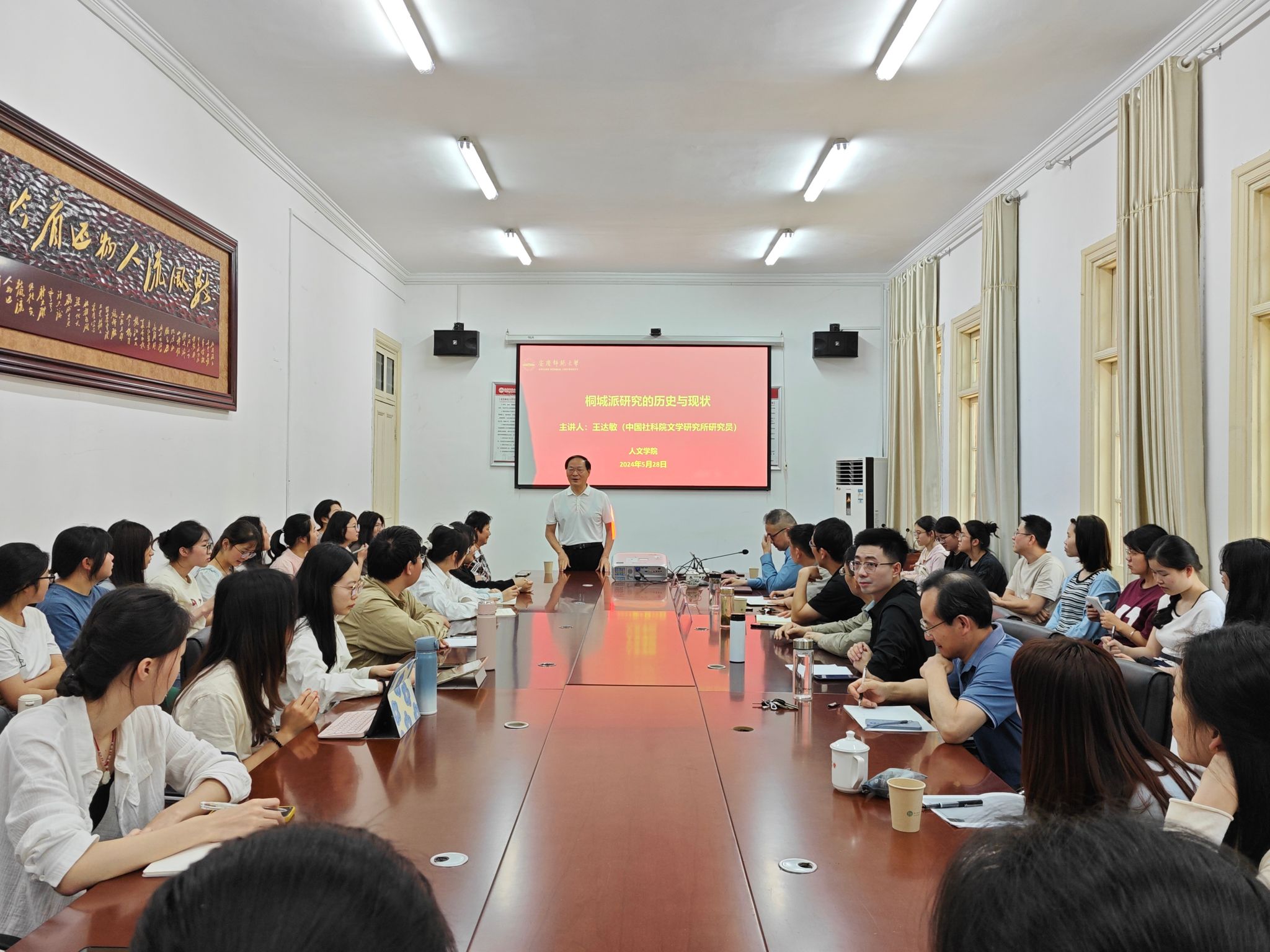5月28日下午,中国近代文学学会副会长、中国古代散文学会副会长、安徽省桐城派研究会副会长、中国社科院研究员、安徽大学特聘教授王达敏应邀做客敬敷人文讲坛,主讲题为“桐城派研究的历史与现状”学术讲座。本场讲座由beat365英国官方网站院长汪孔丰教授主持,皖江文化数字化保护与智能处理实验室执行主任童岳敏教授、副主任徐文翔副教授担任与谈人,beat365官网部分教师及研究生、本科生参加了此次活动。