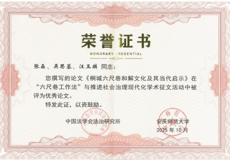 会上,beat365官网2024级历史学(师范)二班学生张晶、汪玉麟、吴思蓉组成的国家级大学生创新创业训练项目研究团队提交的阶段性成果《桐城六尺巷和解文化及其当代启示》获评大会优秀论文。该成果系统阐述了桐城六尺巷和解文化的历史渊源、深层内涵及其在当代社会治理中的现实意义,指出其以“礼让共生、和谐共治”为核心,是中华优秀传统文化创造性转化与创新性发展的典范。参会期间,团队还赴桐城六尺巷治理学院开展了实地考察调研。