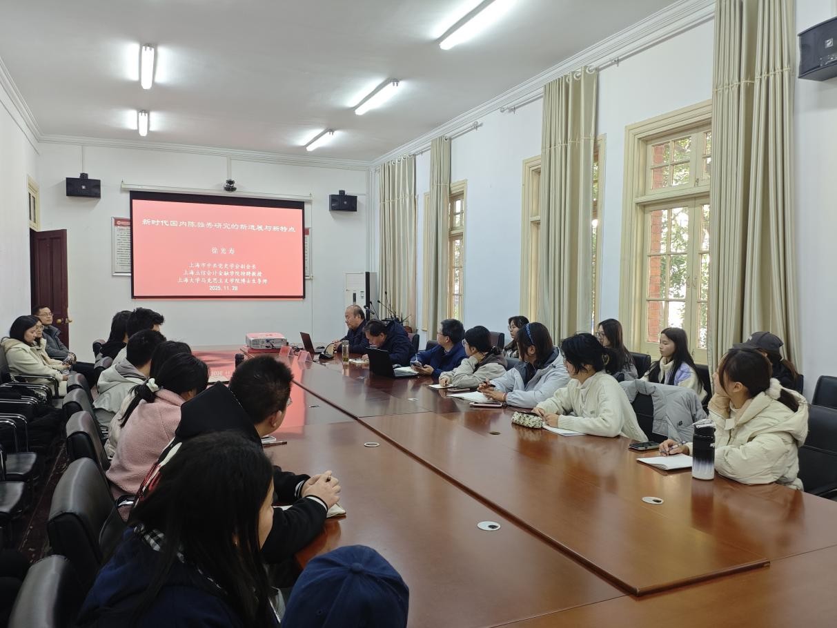 11月28日下午,上海立信会计金融学院特聘教授、博士生导师徐光寿教授应邀做客敬敷人文讲坛,作题为“新时代以来国内陈独秀研究的新进展与新特点”的学术讲座。本场讲座由beat365英国官方网站教授董根明主持,beat365英国官方网站部分教师及研究生和本科生参加活动。