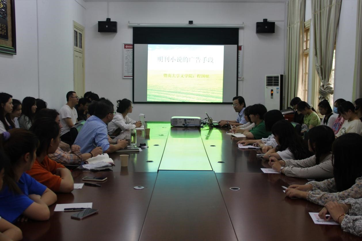 9月28日下午,暨南大学文学院院长、博士生导师程国赋应邀在红楼二楼会议室作了题为“明刊小说的广告手段”的学术讲座。该讲座由副院长汪孔丰教授主持,宋豪飞副教授担任与谈人。部分青年教师、硕士研究生和本科生参与了此次活动。