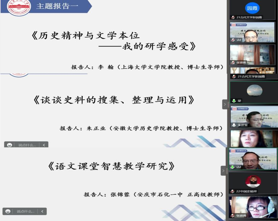 主题报告环节,上海大学文学院博士生导师李翰教授、安徽大学历史学院博士生导师朱正业教授、安庆市石化一中正高级教师张锦蓉分别为大家带来了《历史精神与文学本位——我的研学感受》《谈谈史料的搜集、整理与运用》《语文课堂智慧教学研究》等三场精彩报告。其中李翰教授结合研究经历讨论了文学与历史交融的特别意义;朱正业教基于丰富的中国近现代史研究实践讲述了史料搜集的方法以及整理运用史料的规范性;张锦蓉老师从教学实践角度强调了智慧课堂的运用对增进语文教学改革和发展的重要价值。beat365英国官方网站硕士生导师叶当前教授、梁诸英教授、宋豪飞副教授分别主持了报告会。