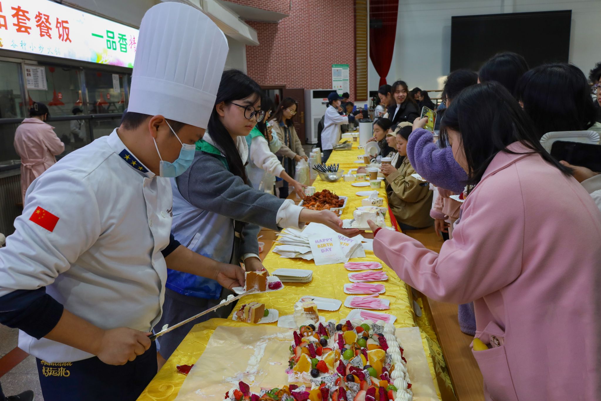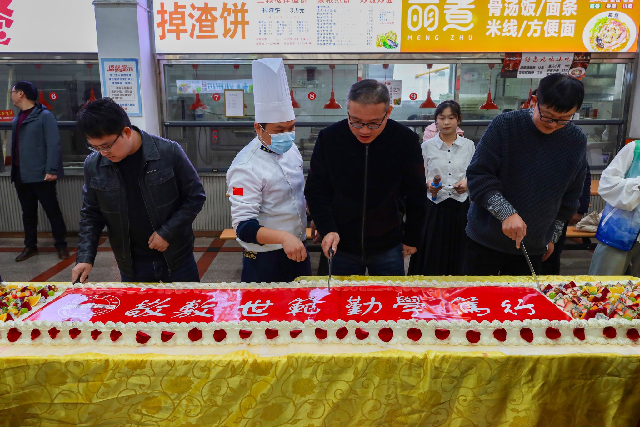 基建与后勤管理处副处长查国平、beat365英国官方网站副院长汪孔丰及安徽中快餐饮有限公司总经理何伦共同切开印有 “敬敷 世范 勤学 笃行” 校训和校徽字样的、并由水果点缀的大蛋糕,宣告着美食节正式拉开序幕。三明治、甜甜圈、泡芙、咖啡等各类西式甜点饮品整齐排列,中式美食糖醋排骨、红烧肉、金牌猪脚等秀色可餐,传统糕点烧卖、发糕、燕麦粥等食品也给现场平添了许多“烟火气息”。