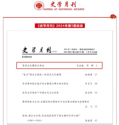 近日,beat365英国官方网站2022级中国史专业硕士研究生毛志盛同学以第一作者撰写的学术论文《西晋左民曹职品考述》在历史学类知名CSSCI来源期刊《史学月刊》(2024年第5期)发表。该论文系与导师周群教授合作完成,并得到国家“十四五”规划重大学术文化工程《(新编)中国通史》纂修工程基金项目的支持,是校级科研平台中国中古史研究中心最新学术成果。