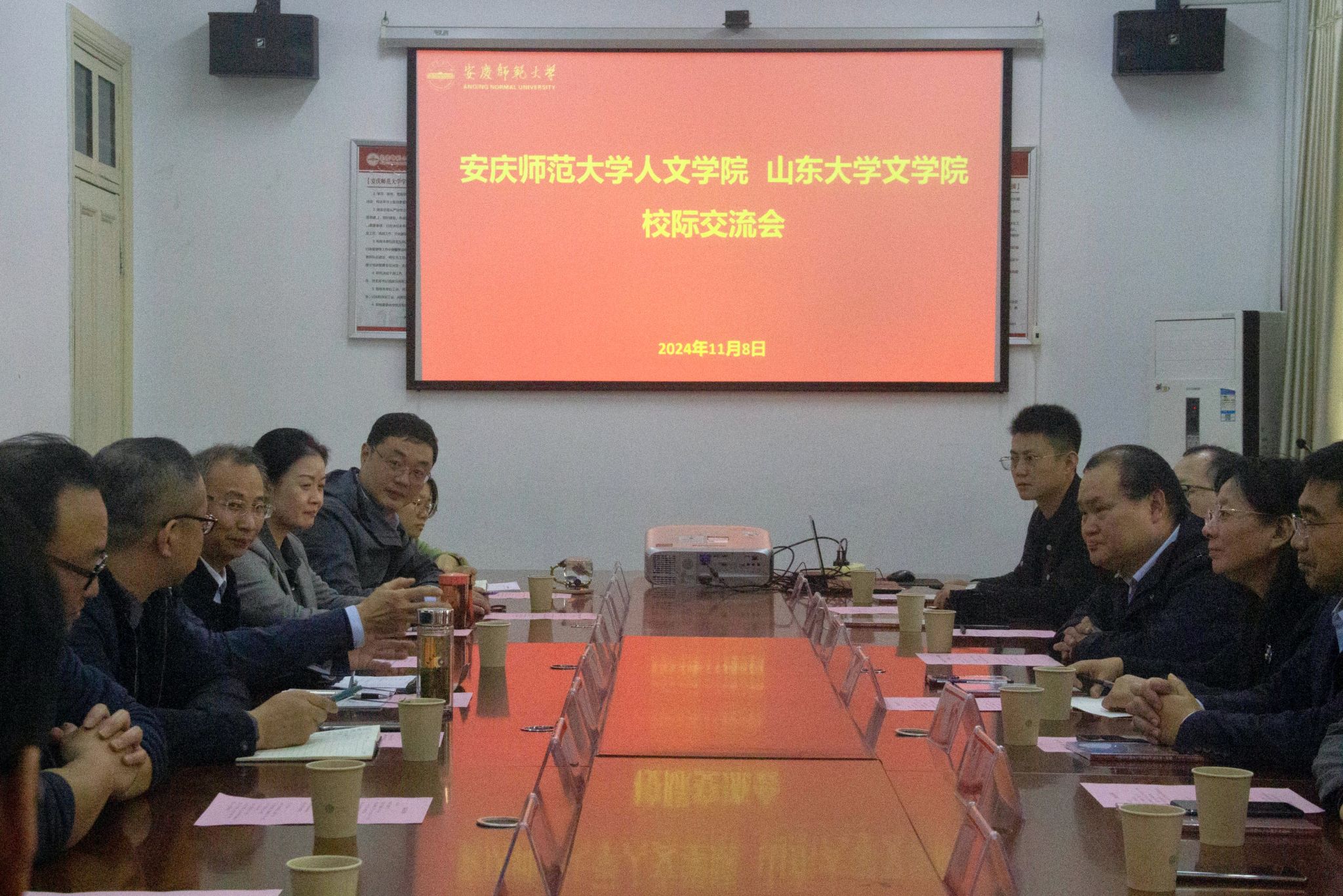 为深化校际间交流,提升合作交流空间,共绘发展蓝图,11月8日,beat365英国官方网站与山东大学文学院在菱湖校区开展校际交流与合作。beat365英国官方网站党政班子与山东大学文学院党委书记郭春晓、东北亚学院党委书记梁奉军一行共叙情谊、共商合作、共谋发展、共话未来。教授代表、安庆市教体局负责人、山大校友代表等参加会议。会议由学院党委书记王波主持。