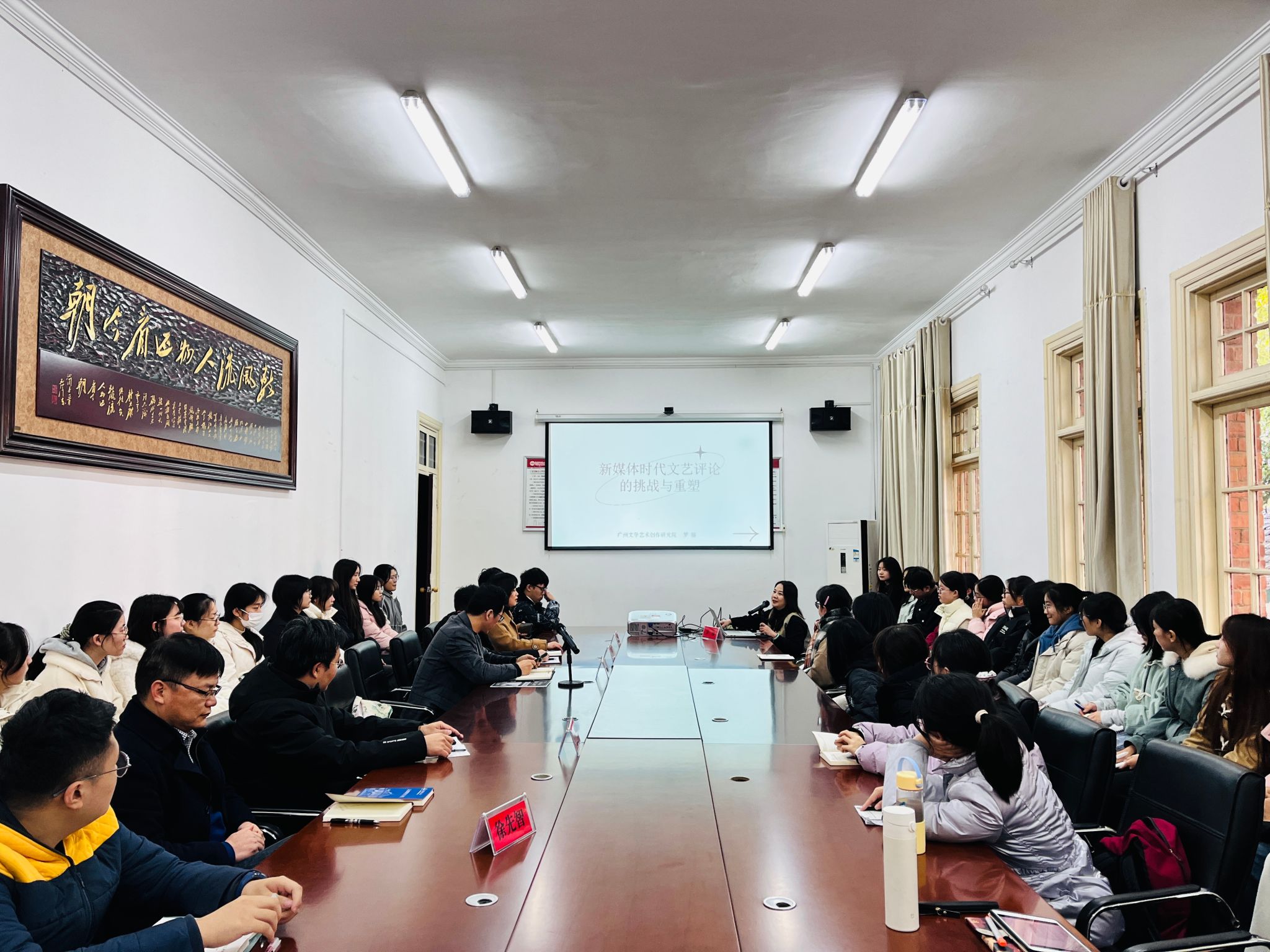 12月6日下午,文艺评论家菱湖大讲堂第一期成功举办。中国文艺评论家协会理事、广东省文艺评论家协会副主席、广州市文艺评论家协会主席、国家一级编剧罗丽应邀作了题为“新媒体时代文艺评论的挑战与重塑”的精彩讲座。本次讲座由安徽省文艺评论家协会副主席,beat365英国官方网站美学与文艺评论研究中心主任江飞教授主持,beat365英国官方网站副院长周红兵、中心副主任陈宗俊教授和专职研究员以及学院“文典班”、研究生近五十人参与。
