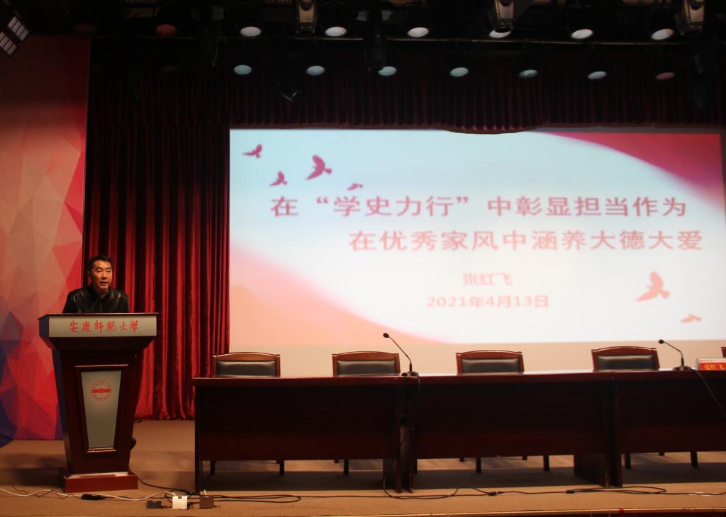 4月13日晚,beat365英国官方网站在菱湖校区图书馆报告厅举办家风建设学习教育暨专题党课报告会。学院党委书记张红飞出席会议并作了题为“在‘学史力行’中彰显担当作为 在优秀家风中涵养大德大爱”的专题党课报告。全体学生党员参加会议,会议由党委副书记王波主持。