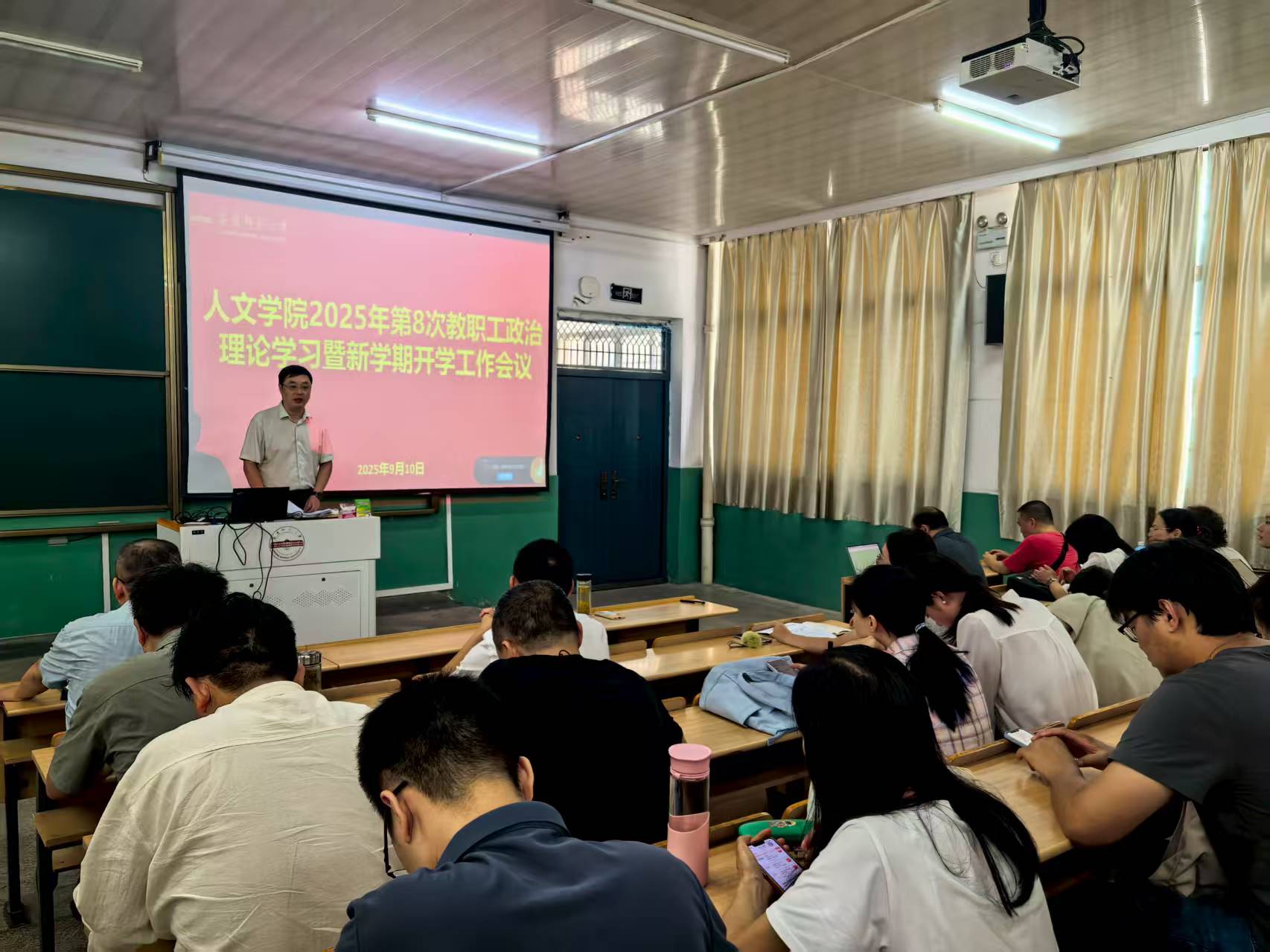 9月10日,beat365英国官方网站在理二阶教室召开2025年第八次教职工政治理论学习暨新学期开学工作会议。学院领导班子、全体教职工参加会议,会议由院长汪孔丰主持。