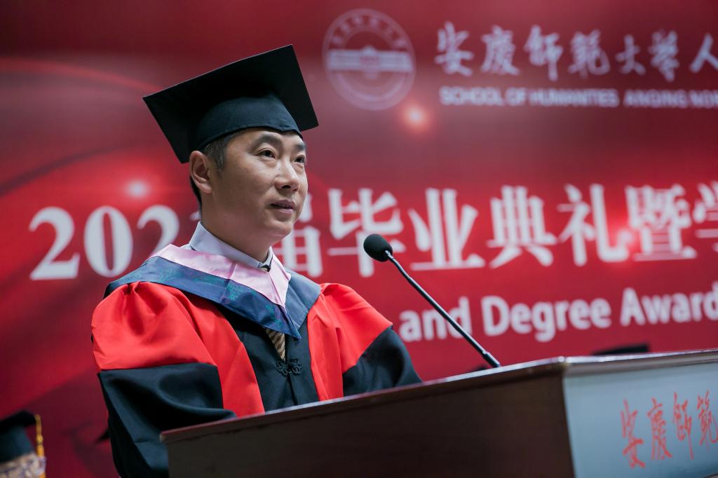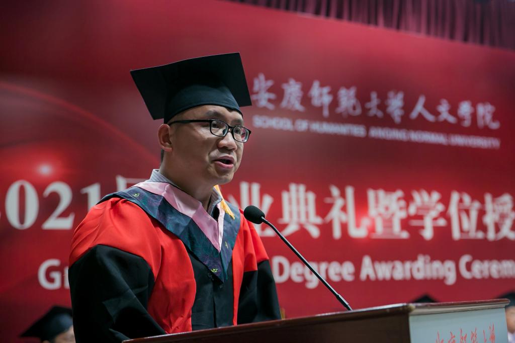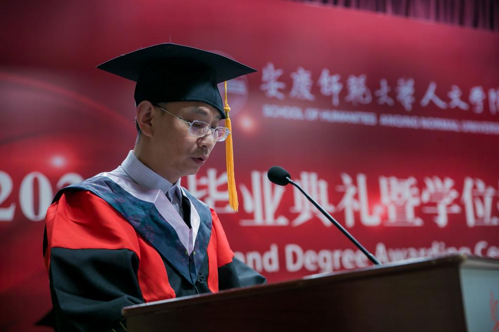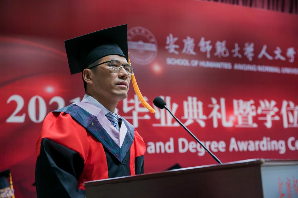 校“三全育人”最美教师、beat365英国官方网站教授、硕士生导师江飞作为教师代表为毕业生送上祝贺与期待。他勉励毕业生永远不要忘记自己作为人文知识分子身份和责任,成为一个脚下有根心中有光的人。