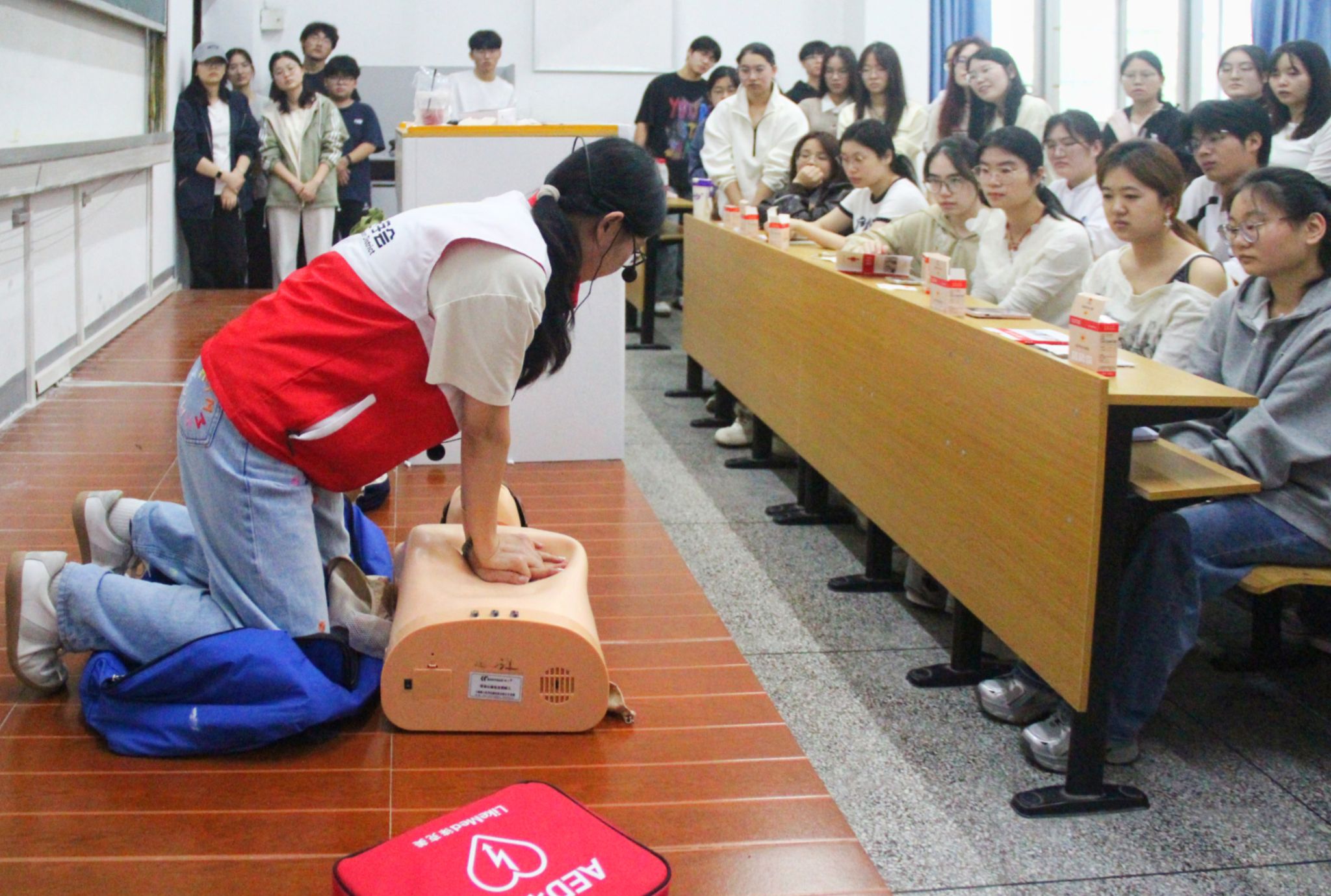 10月15日下午,beat365英国官方网站团委、关工委联合大观区卫健委、红十字会,于10月15日下午在314、315教室开展应急救护技能培训课程。旨在普及应急救护知识、提升师生应对突发事件的急救能力,近200名学生参加活动。