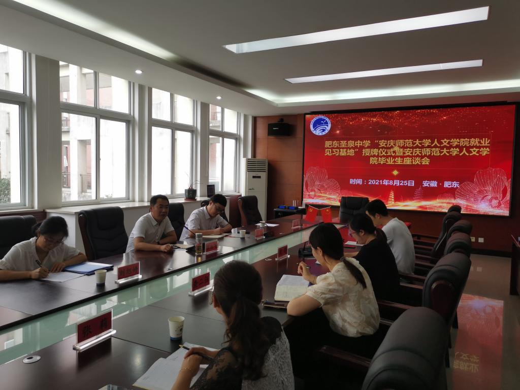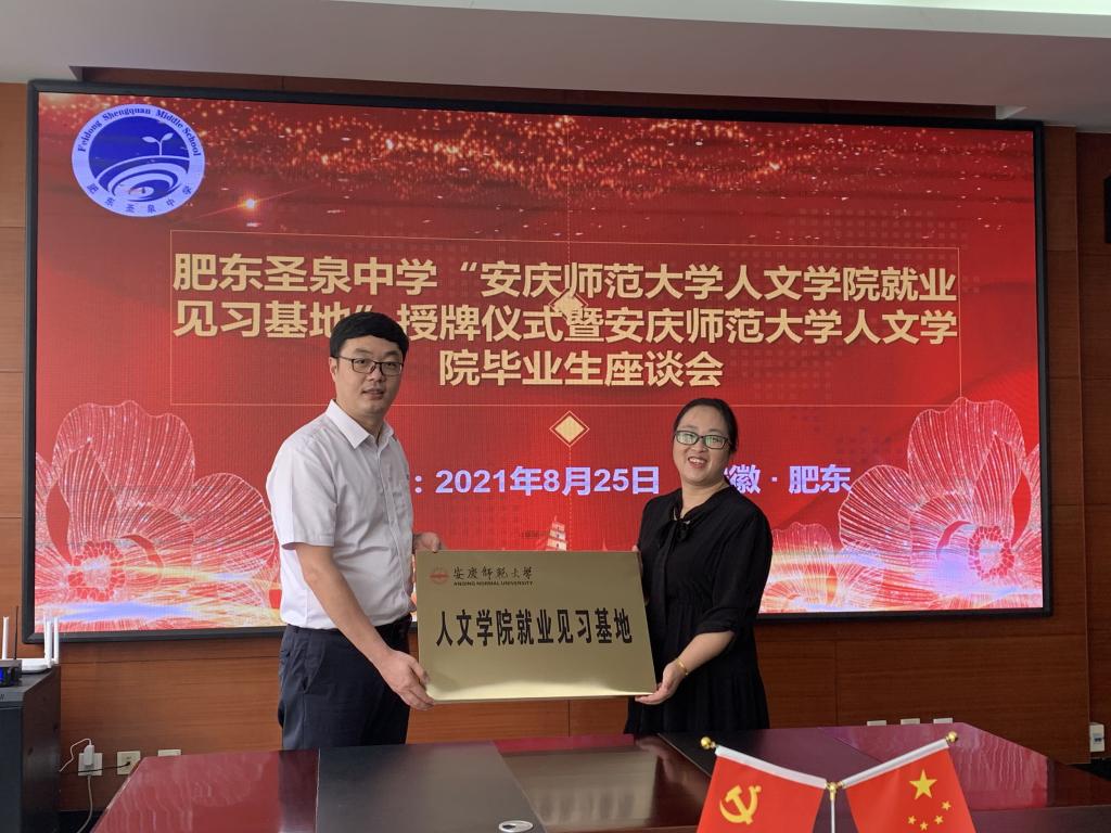 党委副书记王波代表学院为肥东圣泉中学授予“beat365英国官方网站就业见习基地”牌匾。与会人员就人才培养质量、就业见习基地建设等方面展开了深入交流。