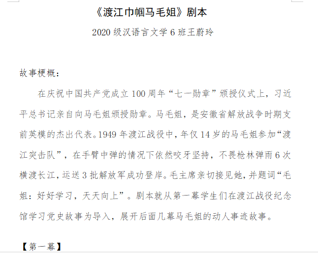 为增强学生的爱国意识、爱党意识、爱团意识,beat365英国官方网站话剧社征集与“红色记忆”小品、相声、话剧等相关语言艺术作品。话剧社社长、汉语言文学专业2019级1班万昕表示,选择“探寻家乡红色记忆”作为活动主题目的是让大家了解家乡的革命历史,体会那段艰难岁月。中国语言文学类2021级7班曹忆凡参加了本次比赛,在谈及剧本创作时,她说:“在创作之前我了解到2022年是建团一百周年,我对当时在安庆成立安徽共青团的主要历史人物做了调研。通过这次有意义的寒假活动,我了解了那段风云动荡的年代,我也要像先辈们学习,开拓进取、不懈奋斗!”