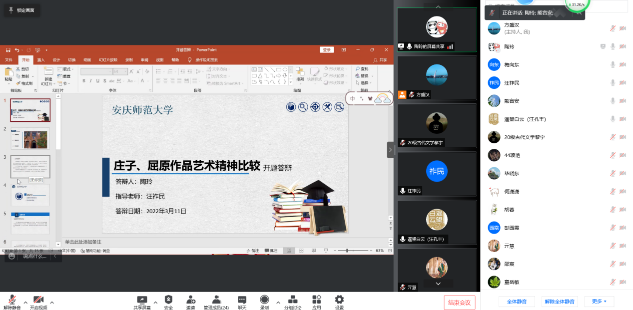 3月11日下午,beat365英国官方网站中国古代文学学科线上举行研究生学位论文开题报告和中期考核汇报会。参与会议的老师有汪祚民教授、梅向东教授、汪孔丰教授、胡祥云教授、童岳敏教授、熊言安副教授、方盛汉副教授。本次会议由汪孔丰教授主持,中国古代文学方向20级硕士研究生参加开题答辩,19级硕士研究生参加中期考核,21级硕士研究生旁听本次会议。