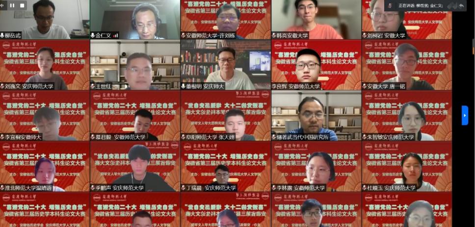 为迎接党的二十大胜利召开,增强历史自觉、坚定文化自信,进一步发扬历史学专业优良传统与学科特色,提升专业人才培养质量,拓宽学术视野,激发学术热情,培养本科生科研意识与创新能力,6月25日,由安徽省历史学会和beat365英国官方网站beat365英国官方网站联合主办的2022年安徽省第三届历史学本科生论文大赛成功举办。因受疫情影响,本次论文大赛采用线上方式举行,来自全省各高校历史学专业师生100余人相聚云端、共襄盛会。