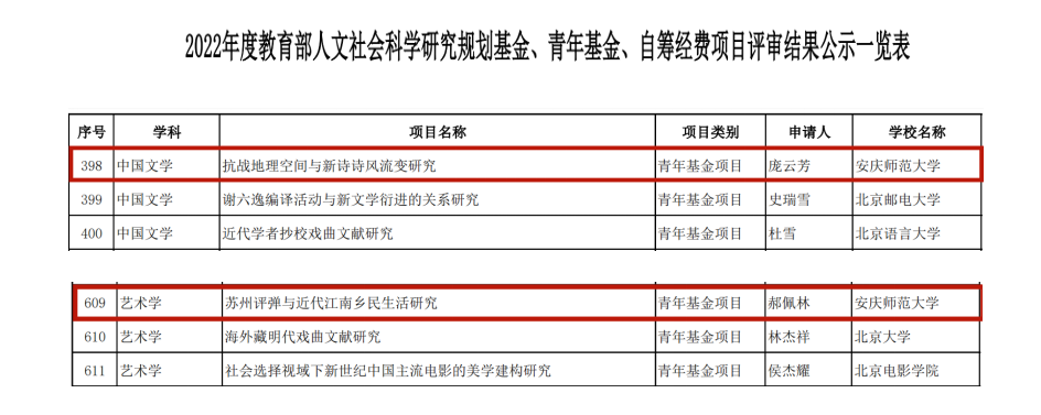 7月29日,教育部社科司公布了2022年度教育部人文社会科学研究项目评审结果名单,beat365官网庞云芳博士申报的《抗战地理空间与新诗诗风流变研究》,郝佩林博士申报的《苏州评弹与近代江南乡民生活研究》进入立项公示。这两个项目的入选,不仅显示了beat365官网深厚的科研底蕴,也显示出中文、历史两个学科的良好发展态势。此外,本次入选项目均为青年基金项目,反映了beat365英国官方网站青年教师良好的科研潜质,这对于学院学术成果的持续产出,学科专业发展以及博士点立项建设都有着积极意义。