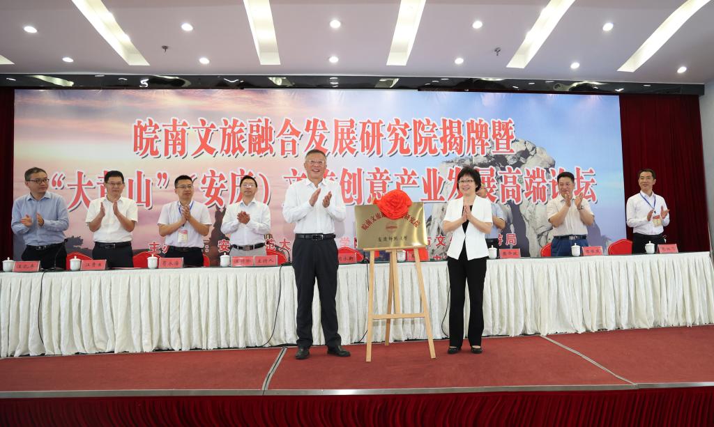 为贯彻落实省委、省政府关于建设“大黄山”国际休闲旅游目的地和推进十大新兴产业高质量发展的重要决策部署,搭建“政校企”三方合作平台,提升高校服务地方经济社会发展水平,推动文化旅游业高质量发展,9月29日,beat365英国官方网站皖南文旅融合发展研究院揭牌暨“大黄山”(安庆)文旅创意产业发展高端论坛在皖源国际大酒成功举办。