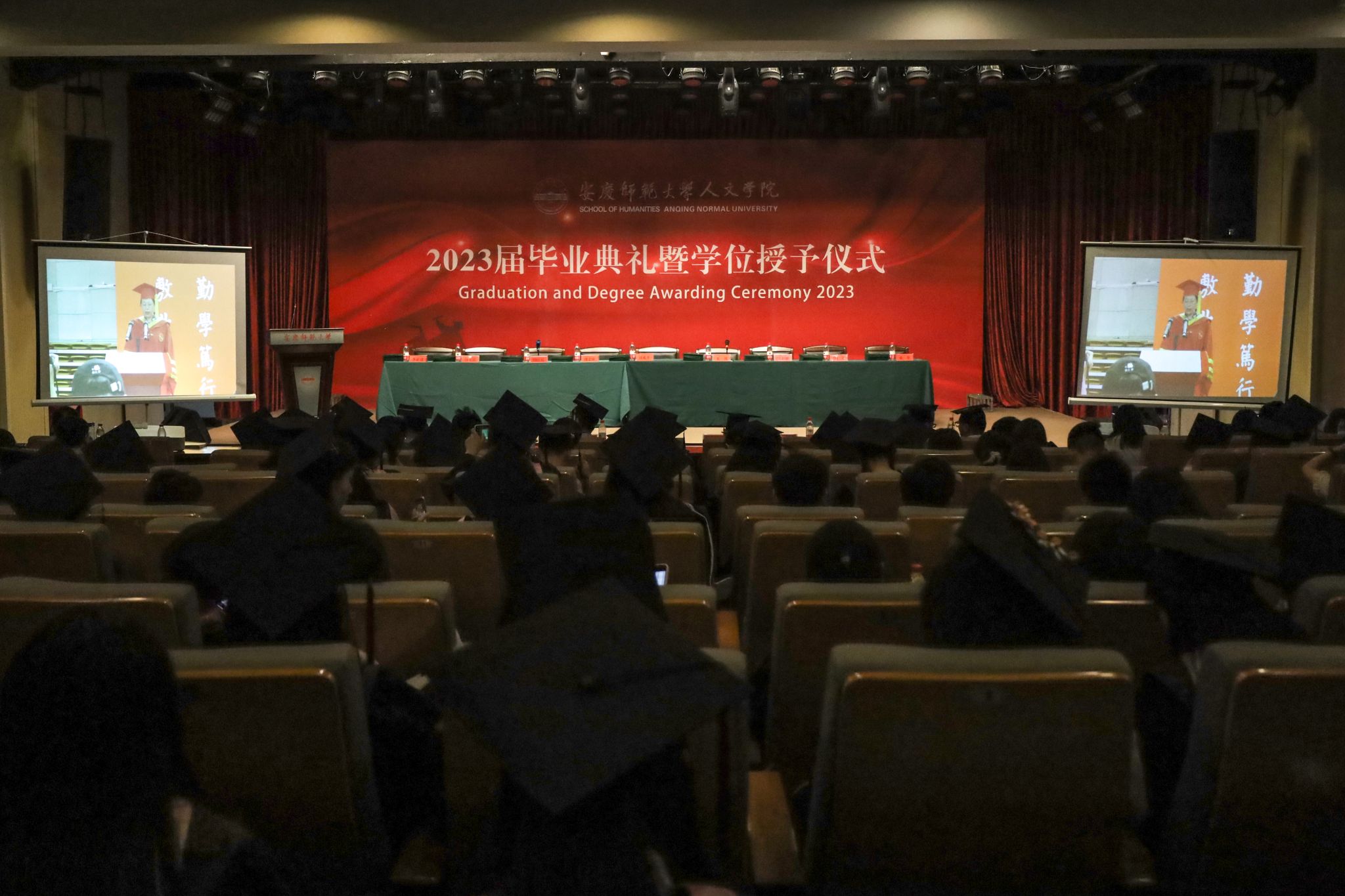 学位授予仪式上,2023届全体毕业生身着学士服,以此走上主席台,学院领导为其一一正冠拨穗,并授予学位证书,合影留念。