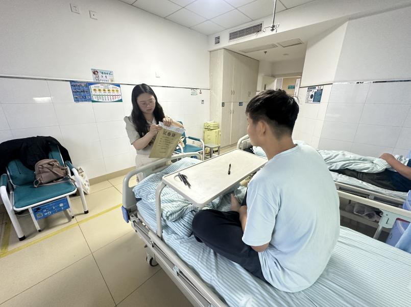 上午8点45分,两位监考人员抵达病房做考前准备;8点55分,主监考王英老师拆封试卷;9点,准时开考。在考试过程中,考生一直保持专注,认真答题。大约一个半小时后,考生举手示意交卷,监考老师检查材料并收卷后,考试正式结束。辅导员王英老师代表学院为考生送上慰问,也祝愿他能在本次考试中取得佳绩,考生对学院的暖心举动表示感激。